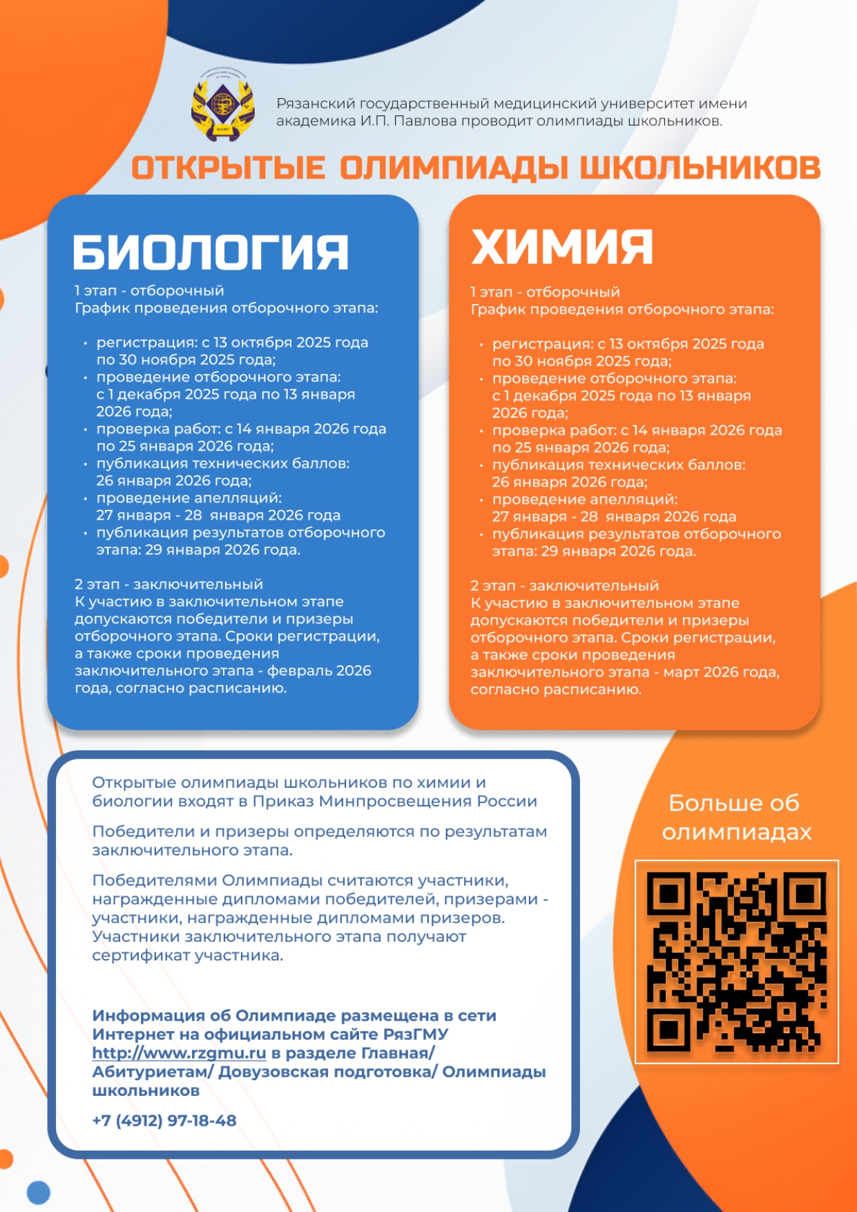 Олимпиады для школьников 10-11 классов ФГБОУ ВО РязГМУ Минздрава России состоят из 2 этапов: